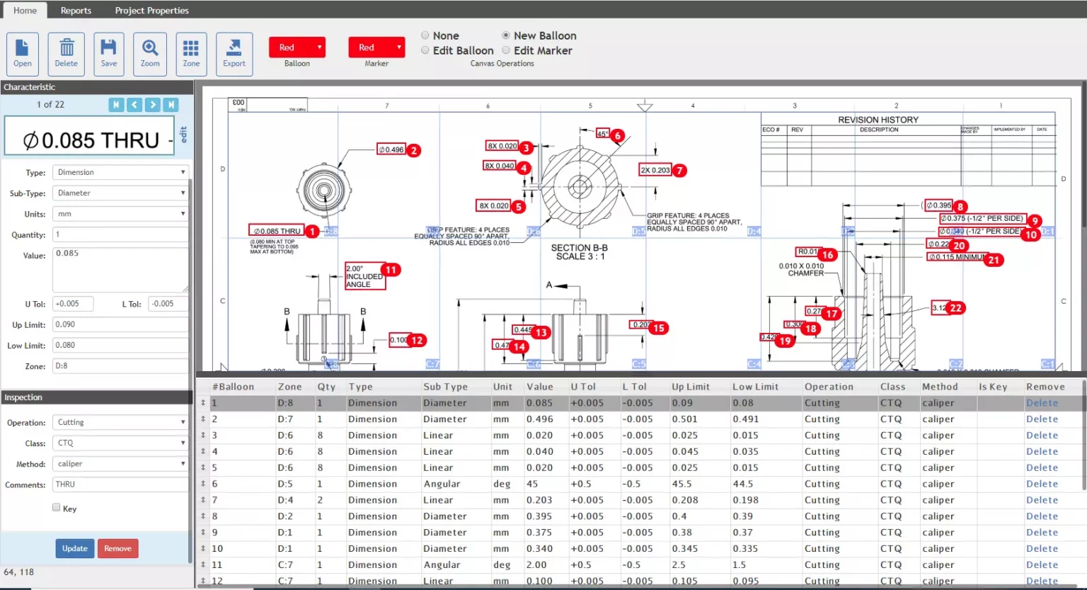 OCR Ballooning is an option to create a control plan. Add a balloon to automatically identify dimensions, along with GD&T specifications with its nominal, tolerances, zone type, etc. It is the fastest and most reliable way to generate FAI.